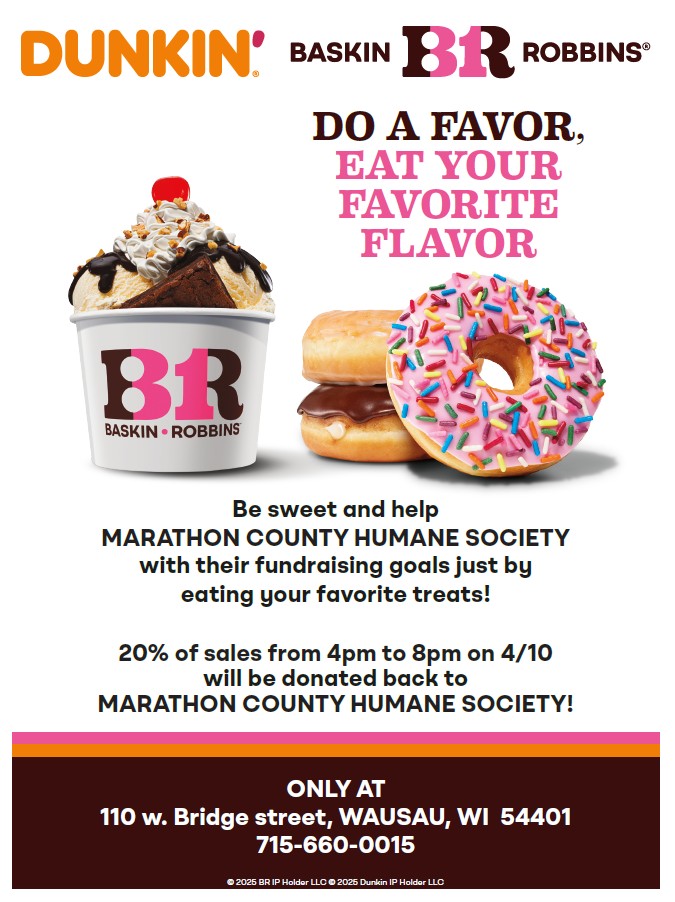 Be sweet and help HSMC just by eating your favorite treats! 20% of sales from 4-8:00pm will be donated back to HSMC. ONLY AT 110 W Bridge St Wausau, WI 54401